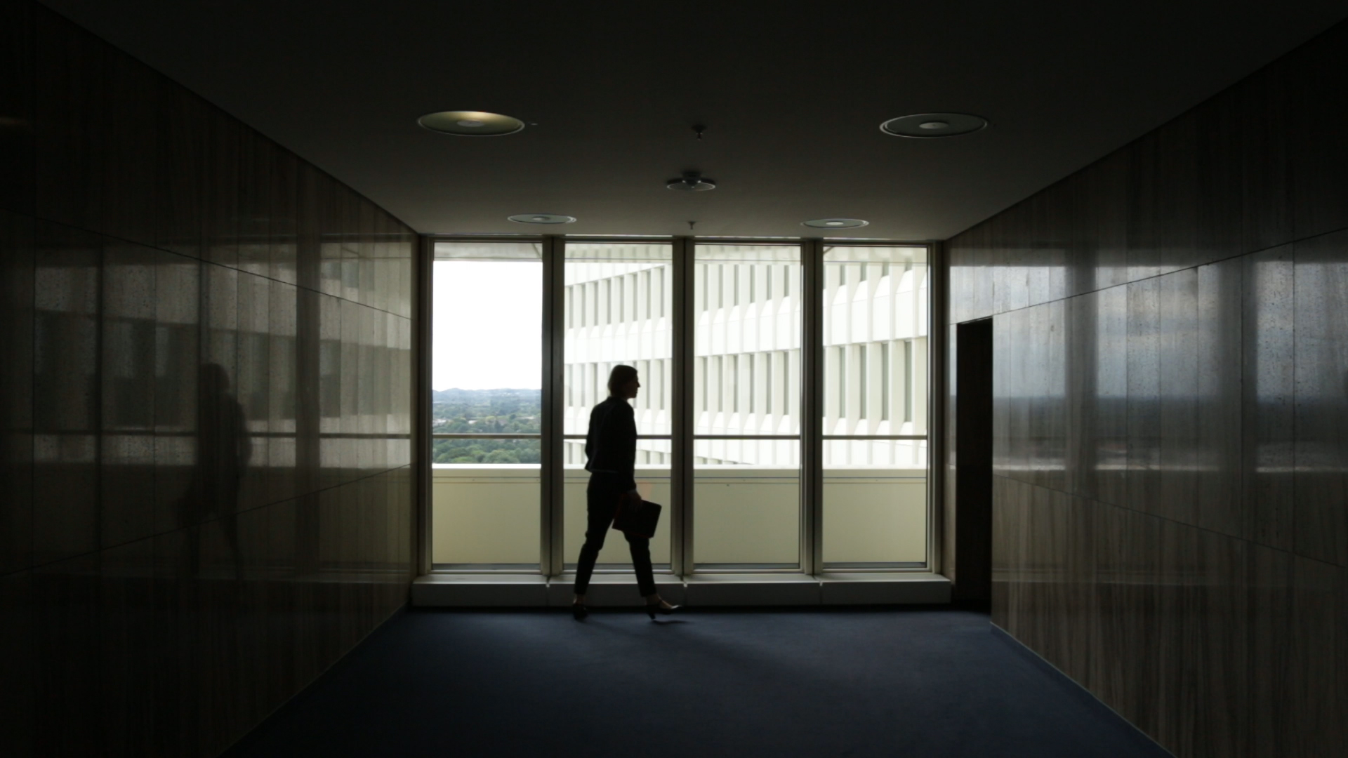 In FLEXIBLE BODIES a high-rise building protrudes out of its surroundings as a strange object. It's the (already dated) materialized utopia of an ideal workspace, dreams of career opportunities and selfoptimization echoing through the hallways. In and around the building bodies converge: working, exercising, growing. While we follow a woman through the building, the question arises which bodies here are real or if what we are seeing is part of an elaborate plan or just part of someone's phantasy.